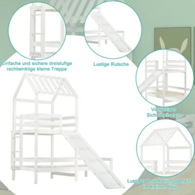 Die untere Koje ist ein Schlafbereich, in dem sich die Kinder frei bewegen können. Ihr Kind kann sich auf der Rutsche im Spielbereich des Dachbodens in der oberen Koje vergnügen und spielen. Der Dachboden ist mit Sicherheitszäune ausgestattet, um Stürze zu verhindern.
