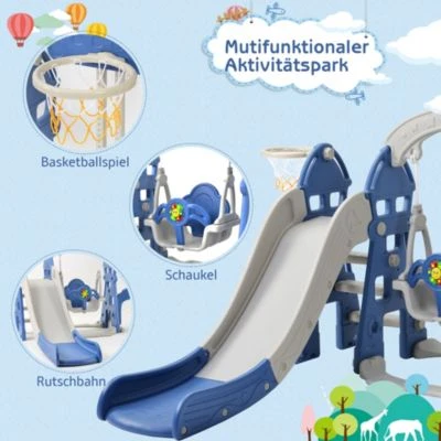 Mutifunktionale Spielturm: Diese 5-in-1 Kinderrutsche besitzt Rutschbahn, Klettergerüst, Basketballkörbe, Fußballtor und Schaukel, die viele Spielmöglichkeiten für Kinder bietet. Die Rutsche kann nicht nur den Kindern Spaß machen, sondern auch ihre Muskeln, Kräft und Hand-Augen-Koordination zureichend trainieren.