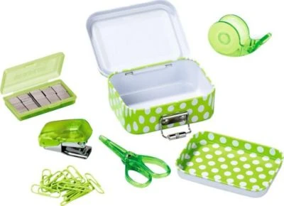 Büroaustattung im Miniturformat. Hier erhältst du alles, was das Schreibtischherz begehert. Egal ob Tacker, Büroklammern,Schere oder Tesafilm. Alle wichtigen Utensilien für den Büroalltag findest du in der kleinen Dose. Kaum zu Glauben, aber wahr.
