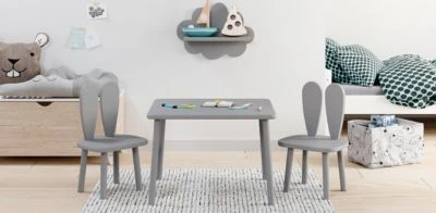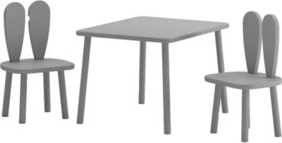 Die Nordville Kinder Sitzgruppe Häschen besteht aus einem stabilen Tisch und zwei robusten Stühlen mit Hasenöhrchen-Rückenlehnen. Mit diesem niedlichen Set kann Ihr Kind seine Kreativität und Selbstständigkeit beim Malen, Zeichnen, Kneten, Zusammensetzen von Puzzles oder Bauklötzen entdecken. Zusätzlich helfen ein eigener Stuhl und ein eigenes Tischchen beim Erlernen des Essens am Tisch. Die Möbel sind aus sehr solidem Buchenholz und MDF-Platten gefertigt. Die verwendeten Materialien gewährleisten Langlebigkeit und Stabilität für viele Jahre.