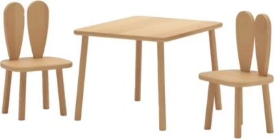 Die Nordville Kinder Sitzgruppe Häschen besteht aus einem stabilen Tisch und zwei robusten Stühlen mit Hasenöhrchen-Rückenlehnen. Mit diesem niedlichen Set kann Ihr Kind seine Kreativität und Selbstständigkeit beim Malen, Zeichnen, Kneten, Zusammensetzen von Puzzles oder Bauklötzen entdecken. Zusätzlich helfen ein eigener Stuhl und ein eigenes Tischchen beim Erlernen des Essens am Tisch. Die Möbel sind aus sehr solidem Buchenholz und MDF-Platten gefertigt. Die verwendeten Materialien gewährleisten Langlebigkeit und Stabilität für viele Jahre.
