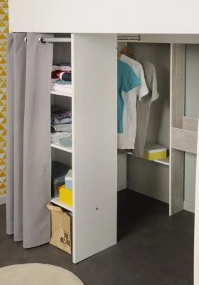 So sieht gut genutzter Platz aus! Unter der Liegefläche befindet sich eine Nische mit einem integrierten Schreibtisch und einem kleinen Kleiderschrank. Offene Fächer oben und unten bieten extra Stauraum auf beiden Ebenen.