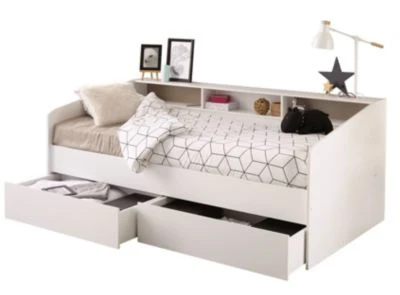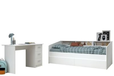 Lieferumfang: Bett inkl. 2x Bettschubkästen, Schreibtisch (ohne Lattenrost, Matratze und Dekoration) Selbstaufbau, mit ausführlicher Montageanleitung 90 x 200 cm Für die Zustellung wird unbedingt eine tagsüber erreichbare Telefonnummer benötigt. Bett mit praktischen Ablagefächern Bettschubkasten – 2er Set Rückwände einzeln drehbar Schreibtisch mit 3x Schubkästen
