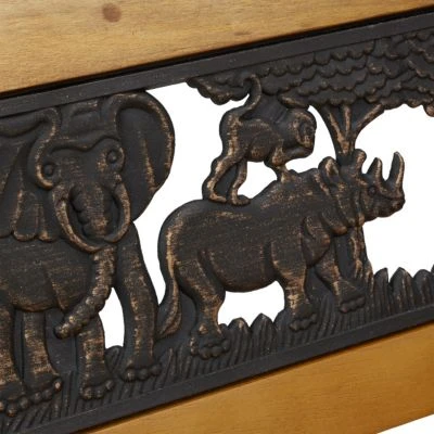 • Verziert: Rückenlehne mit Motiv aus PVC – Savanne-Szene mit Elefant, Affe, Nashorn, Löwe und Giraffe