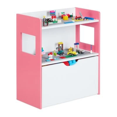 Dieses Kinderregal bietet alles, was Dein Kind zum Spielen mit Klemmbausteinen benötigt. Auf 2 integrierten Grundplatten lassen sich tolle Baukreationen erstellen – der Kreativität sind keine Grenzen gesetzt. Nach dem Spielen lassen sich die Bausteine und auch andere Spielsachen einfach in der Spielzeugkiste verstauen. Dank der Rollen lässt sich die Aufbewahrungsbox einfach herausziehen, sodass bereits Kleinkinder diese selbstständig aus- und einräumen können.