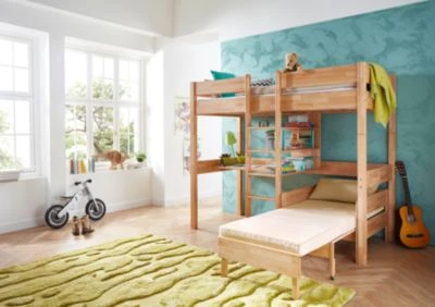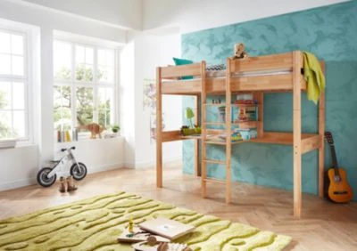 Oben eine kuschelige Liegefläche und der eingebaute Arbeitsplatz unter dem Bett gehört gleich mit dazu. Durch die massive Bauweise und den hochwertigen Verarbeitungen werden Sie viele Jahre Freude an dem Hochbett haben.
