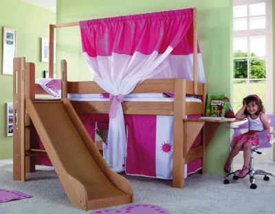 Das Vorhangset mit süßem Sonnensymbol umschließt den unteren Teil des Bettes von 3 Seiten. Durch die kleine Stofftür, welche aufgerollt und festgebunden werden kann, gelangt man in die neue Spielhöhle.