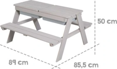 Diese robuste und wetterbeständige Kindersitzgarnitur „Outdoor + Spielwannen und Bankkissen“ kommt aus dem Hause Roba und eignet sich sowohl für drinnen als auch für draußen. Auf der abnehmbaren Tischplatte kann gemalt, gebastelt oder gespielt werden – nimmt man diese ab, kommen zwei herausnehmbare Spielwannen zum Vorschein, die zum Spielen mit Sand und Wasser einladen. Im Lieferumfang sind auch zwei Sitzkissen passend zu den Bänken enthalten, um einen angenehmen Komfort zu bieten. So kann die Garnitur vielfältig genutzt werden und sorgt dabei für jede Menge Spielspaß.