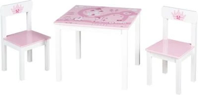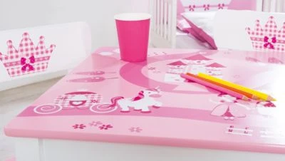 Die dreiteilige Kindersitzgruppe KRONE von ROBA zeigt sich mit hübsch bedruckten Stuhlrücken und einer ebensolchen Tischplatte. Die Motive im Prinzessinnenstil sind fröhlich und liebevoll gestaltet. Die Beschaffenheit aus stabilem MDF sorgt dafür, dass Ihr Kind an diesen Möbeln lange Freude haben.