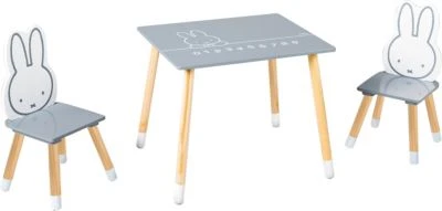 Diese Kindersitzgruppe aus dem Hause Roba besteht aus einem Tisch sowie zwei Stühlen, die mit süßen Miffy-Motiven gestaltet sind. Hiermit können Kinder von klein auf am Tisch essen, basteln oder spielen.