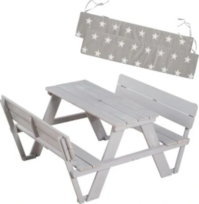 Diese stabile und kippsichere Kindersitzgruppe „PICKNICK for 4′ Outdoor + mit Lehne und Bankkissen“ stammt aus dem Hause Roba und bietet Platz für bis zu vier Personen. Die Bänke sind mit Rückenlehnen und passenden Sitzkissen ausgestattet, sodass auch der Komfort nicht zu kurz kommt. Der Tisch und die Bänke sind direkt miteinander verbunden, um die nötige Sicherheit zu ermöglichen. Die Sitzgruppe kann dank ihrer wetterfesten und langlebigen Eigenschaften sowohl drinnen als auch draußen verwendet werden. Sie eignet sich ideal zum Beispiel zum Picknicken, Malen oder zum Puzzeln.