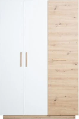 Der dreitürige roba Kleiderschrank Lion in modernem Weiß mit Dekorelementen in „Artisan Eiche“ ist das Highlight in einem neu eingerichteten Baby- oder Kinderzimmer. Eine in Holzoptik gestaltete Tür sowie die hochwertigen Griffe aus Eiche-Massivholz runden das weiße Design des Schrankes gelungen ab. Hinter den drei Türen des Schranks verbirgt sich viel Stauraum für Kleider, Kinderspielzeug oder Bücher. Der Kleiderschrank bietet dank seiner sieben Fächer sowie einer Kleiderstange viel Platz zum Verstauen. Durch die eingebaute Soft-Close-Technik lassen sich die Türen sanft und leise schließen.