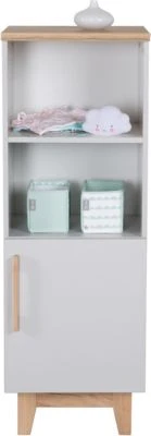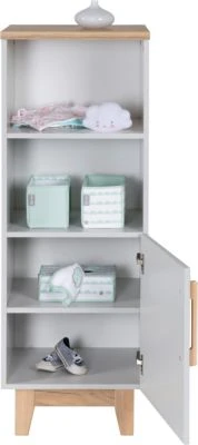 Das Roba Standregal „Caro“ bietet hinter seiner Tür und in den zwei offenen Regalfächern Stauraum für Kinderspielzeug und Kinderkleidung und sorgt so für Ordnung im Kinder- oder Babyzimmer. Hinter der Tür im unteren Bereich des Standregals finden zum Beispiel Söckchen, Unterwäsche, oder Bücher ihren Platz. Die eingebaute Soft Close-Technik ermöglicht ein sanftes, leises Schließen der Tür. Das schlanke Regal verfügt als besonderes Design-Highlight über eine schwebende Optik der Deckplatte.