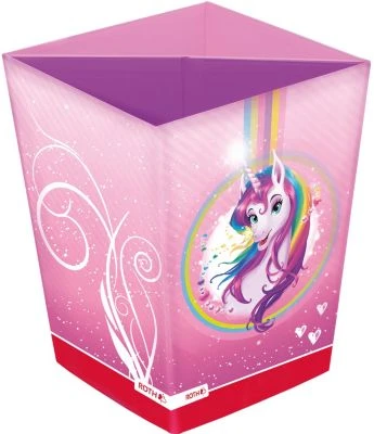 Der Papierkorb kann platzsparend zusammengefaltet werden. Er ist passend zu den Roth-Schultütenmotiven und schult das Umweltbewusstsein mit seinen getrennten Fächern für Plastik und Papier. Einfaches Aufstellen: Druckknöpfe am Boden schließen und mit Magnet beide Teile des Papierkorbs verbinden Pappe 280/215/215