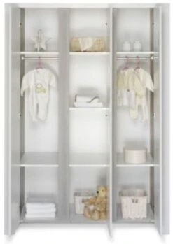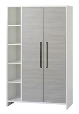 Der 2-türige Kleiderschrank hat neben zwei großen Einlegeböden und einer großen Kleiderstange ein Seitenregal mit fünf offenen Fächern. Beide Türen sind mit einem Soft-Close-System ausgestattet und lassen sich somit leicht Öffnen und Schließen. Die langen Chrom-Griffleisten geben dem Schrank eine klare Linie.