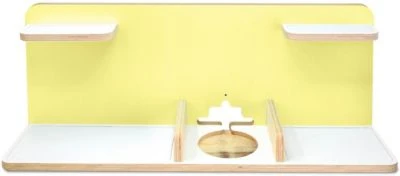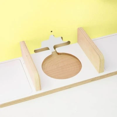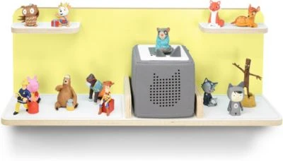 Einen tollen Platz zum Beispiel für die Toniebox bietet dieses praktische Regal von stadtecken. Während die Musikbox auf dem unteren Regalbrett zwischen den beiden aufgestellten Keilen ihren Platz findet und das Ladekabel durch die Aussparung an der Rückwand gelegt wird, können die dazugehörigen Figuren auf den kleinen Ablagemöglichkeiten aufgestellt werden. So ist alles stets ordentlich verstaut und griffbereit.