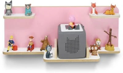 Für alle Fans der beliebten Hörspielbox kommt hier das passende Regal zum Aufstellen! Mit dem Regal „rosa“ von stadtecken ist die Musikbox gut aufgeräumt und die passenden Figuren können übersichtlich aufgestellt werden. Was hören wir denn heute? Der Abstellplatz für die Musikbox ist mit einer Vertiefung für die Ladestation versehen und auf den freien Flächen finden viele der fröhlichen Hörfiguren Platz. Dank der eingebauten Metallbleche bleiben die magnetischen Figuren an ihrem Platz.