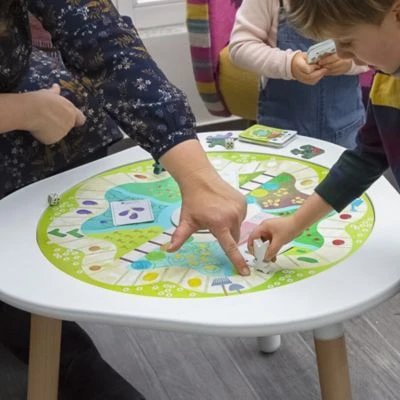 – Inklusive 4 doppelseitiger Spielscheiben mit 7 Aktivitäten und einer – Tischscheibe aus Holz