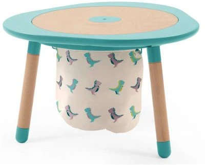 – Aufräumen leicht gemacht! Spielzeugbeutel auf der Unterseite des Stokke® MuTable™ einhängen und Spielzeug einfach durch die Öffnung in der Tischmitte schieben