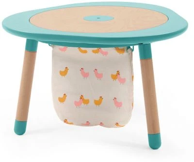 – Aufräumen leicht gemacht! Spielzeugbeutel auf der Unterseite des Stokke® MuTable™ einhängen und Spielzeug einfach durch die Öffnung in der Tischmitte schieben