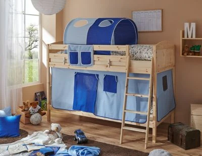 Extra hohe Kopfteile, eine Schrägleiter (wahlweise links oder rechts montierbar) für den sicheren Aufstieg ins obere Bett und viel Platz oben und unten, dafür steht Etagenbett Erni. Die Country-Version dieses Bettes in naturbelassener Optik passt in jedes Kinderzimmer und lässt sich dank vieler Vorhangstoffe noch individuell anpassen! Und wenn die Kinder älter werden kann das Etagenbett ganz einfach zu zwei normal hohen Einzelbetten umgebaut werden.