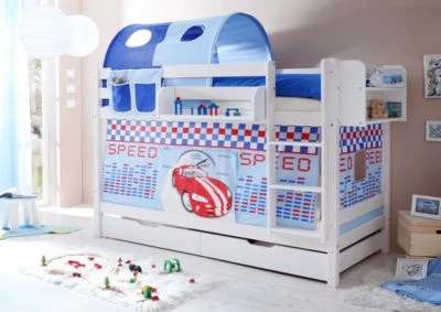 Hier gibt es keine Streiterei mehr wer oben oder unten schlafen darf! Die untere Liegefläche vom Etagenbett „Marcel“ schafft dank frei auswählbarem Vorhang eine „Höhlenartige“ Atmosphäre, während die obere mit dem optional erhältlichen Tunnel einen gemütlichen Charakter besitzt. Die massive Bauweise, hohe Pfostenstärke und Fallschutz sorgen für die nötige Sicherheit. Dank vieler praktischer Ergänzungsprodukte kann dieses Bett auf jeden Geschmack ausgerichtet werden. Auch in anderen attraktiven Farben erhältlich!