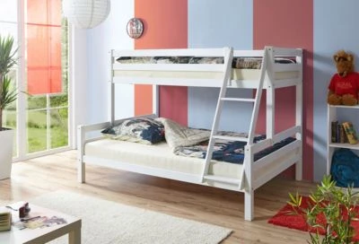 Lieferumfang: Montagematerial und Montageanleitung (ohne Rollroste, Matratzen und Dekoration) extragroße Liegefläche Selbstaufbau, mit ausführlicher Montageanleitung untere Liegefläche max. 180kg, obere Liegefläche max. 75kg (nach DIN741ff.) 90 x 200 cm / 140 x 200 cm Bitte beachten Sie, dass aufgrund der Mehrpaket-Zustellung die Lieferung an zwei aufeinander folgenden Werktagen erfolgen kann! Etagenbett mit zwei unterschiedlich großen Liegeflächen Oben 90x200cm (max. 75kg), unten 140x200cm (max. 180kg) Schräge Leiter für erleichterten Einstieg Etagenbett kann nach Umbau als Einzelbett gestellt werden Aus hochwertigen massiven Buchenholz