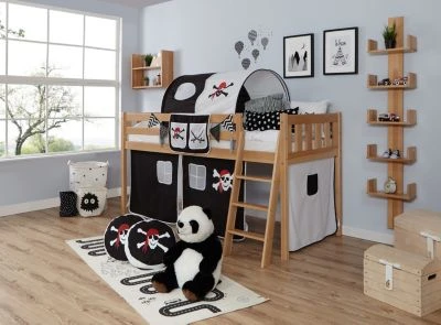 Bei dem Hochbett „Eric“ wurde vor allem bei der Sicherheit nicht gespart. Aus massivem Buchenholz gefertigt, besitzt „Eric“ rundherum einen Fallschutz und bietet eine hohe Standfestigkeit sowie eine Schrägleiter, mit deren Hilfe ein auf- und absteigen leicht gestaltet worden ist. Die wohnliche Optik der hohen Kopfteile ergänzt sich gut in der Atmosphäre des Kinderzimmers. Dieses Bett ist auch in anderen Farben mit anderen Vorhängen erhältlich.