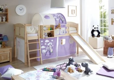 Ein Bett für Kinder darf nicht einfach nur ein Bett sein. Sicherheit, Stabilität und selbstverständlich Spielspaß muss ein Bett versichern. Dieses Hochbett zeichnet sich nicht nur durch eine hochwertige Verarbeitung aus, sondern auch durch die Details, die Ihrem Kind viel Freude mit dem neuen Möbelstück bereiten werden. Die Rutsche kann durch die Leiter ohne Komplikationen erreicht werden. Mit dem Vorhang-Set mit einem kindgerechten Design, entsteht eine neue tolle Spielumgebung für Ihr Kind.