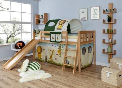 Ein Bett für Kinder darf nicht einfach nur ein Bett sein. Sicherheit, Stabilität und selbstverständlich Spielspaß muss ein Bett versichern. Dieses Hochbett zeichnet sich nicht nur durch eine hochwertige Verarbeitung aus, sondern auch durch die Details, die Ihrem Kind viel Freude mit dem neuen Möbelstück bereiten werden. Die Rutsche kann durch die Leiter ohne Komplikationen erreicht werden. Mit dem Vorhang-Set mit einem kindgerechten Design, entsteht eine neue tolle Spielumgebung für Ihr Kind.