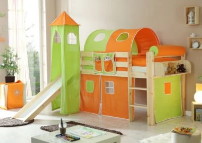 Unter dem Bett findet das Kind, hinter dem Vorhang, eine Rückzugsmöglichkeit zum Entspannen und spielen und oben eine gemütliche Liegefläche. Es besteht komplett aus massiver Kiefer um eine hohe Standfestigkeit zu garantieren. Die Leiter, Rutsche und Turm können wahlweise rechts oder links angebracht werden und passt sich so ideal den Gegebenheiten des Kinderzimmers an. Dieses Bett ist auch in anderen Farben mit anderen Vorhängen erhältlich.