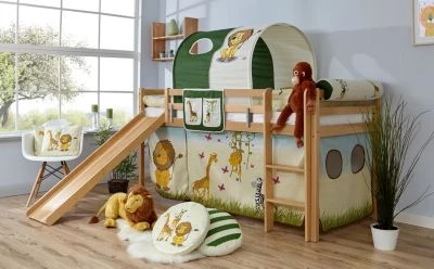 Rutschbett „Rene“ aus massiver Buche bietet viel Platz zum spielen und erholsamen schlafen. Um sich den Gegebenheiten im Zimmer ideal anzupassen lassen sich Leiter und Rutsche wahlweise rechts oder links montieren. Viel extra Zubehör, wie z.B. Vorhänge, Regale oder Tunnel können genutzt werden um das Bett individuell an seinen Benutzer anzupassen. Auch mit weißer Lackierung erhältlich!