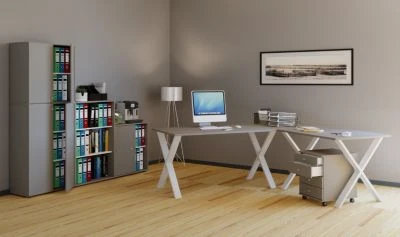Passend zum Schreibtisch sind weitere Büroschränke und Rollcontainer der Serie „VCM Lona“ erhältlich.