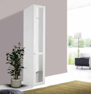 Kleiderschrank „Newport“ 1-türig Attraktiver 1-türiger Kleiderschrank der durch sein modernes Design und durch seine praktische Aufteilung überzeugt. Dieser Schrank bietet Ihnen ausreichend Platz und genügend Aufbewahrungsmöglichkeiten. Farbe: weiß Material: Faserplatte mit pflegeleichter Kunststoffoberfläche Ausstattung / Abmessungen (ca. Maße): – Innendekor Leinen grau – runde Metallgriffe – B/T/H: 45 cm / 58 cm / 236cm